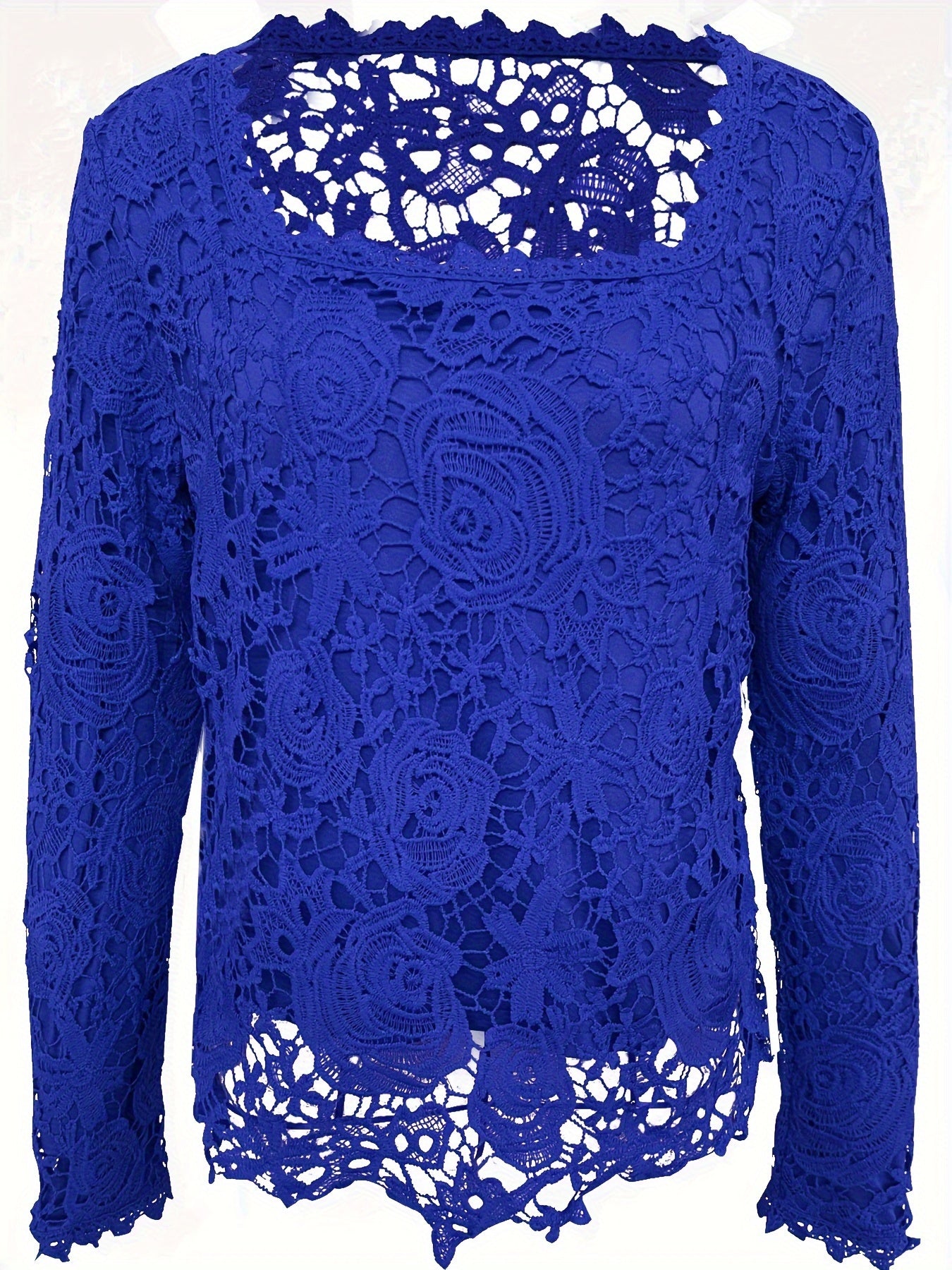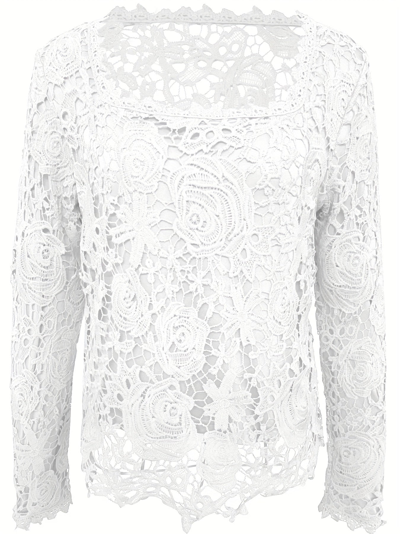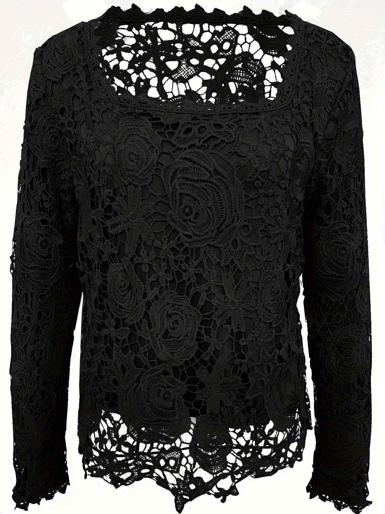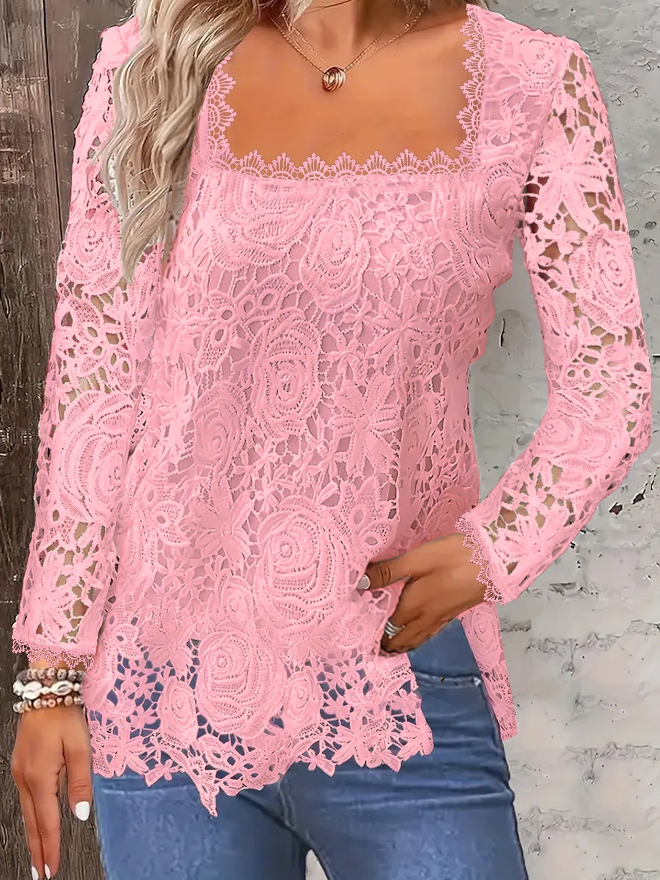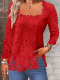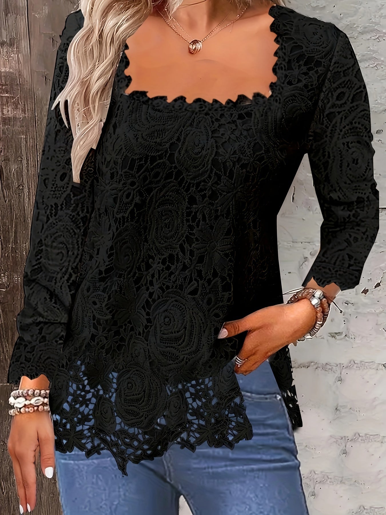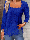 Sale Solid Square Neck Lace T-Shirt, Casual Long Sleeve T-Shirt