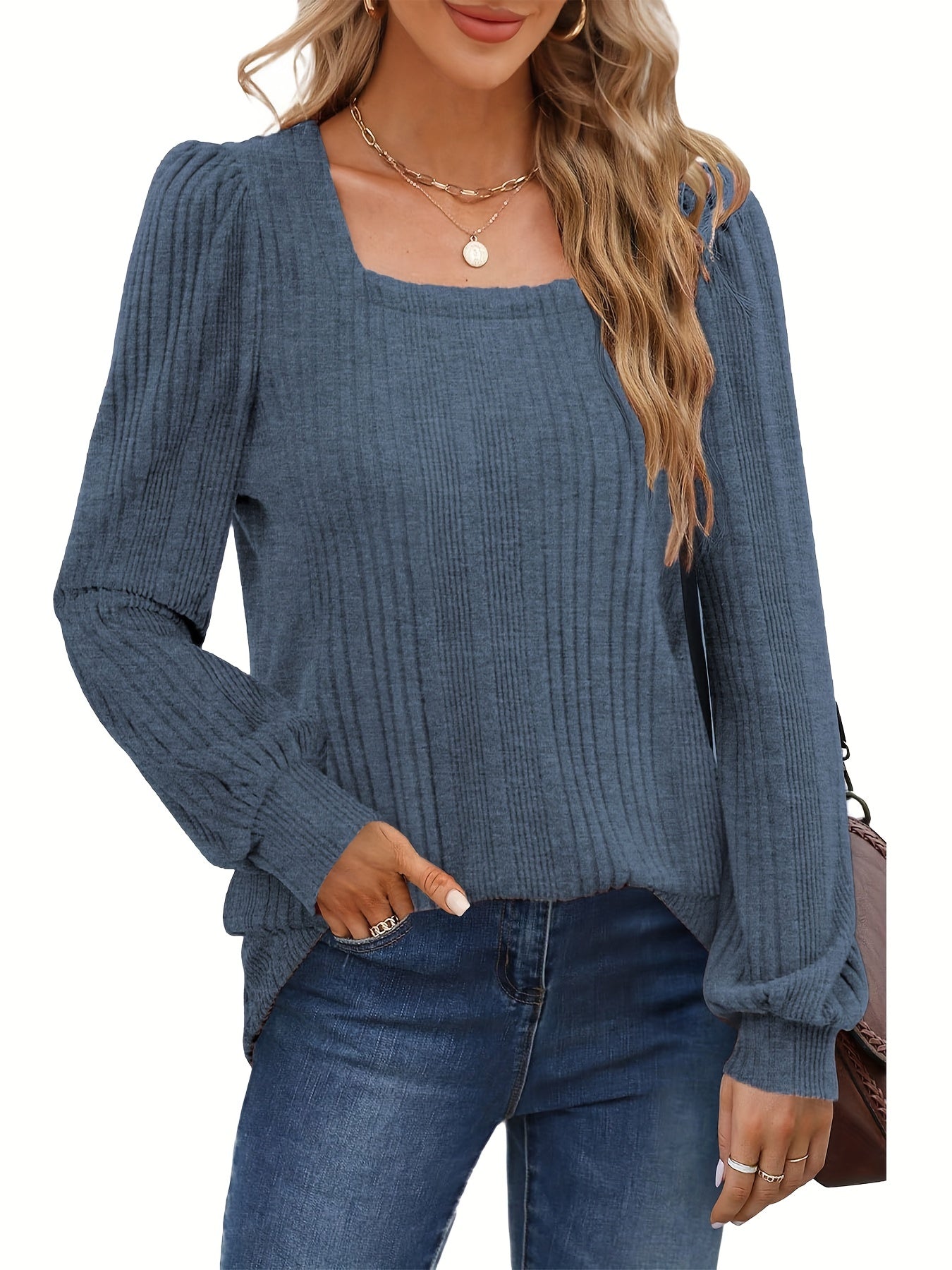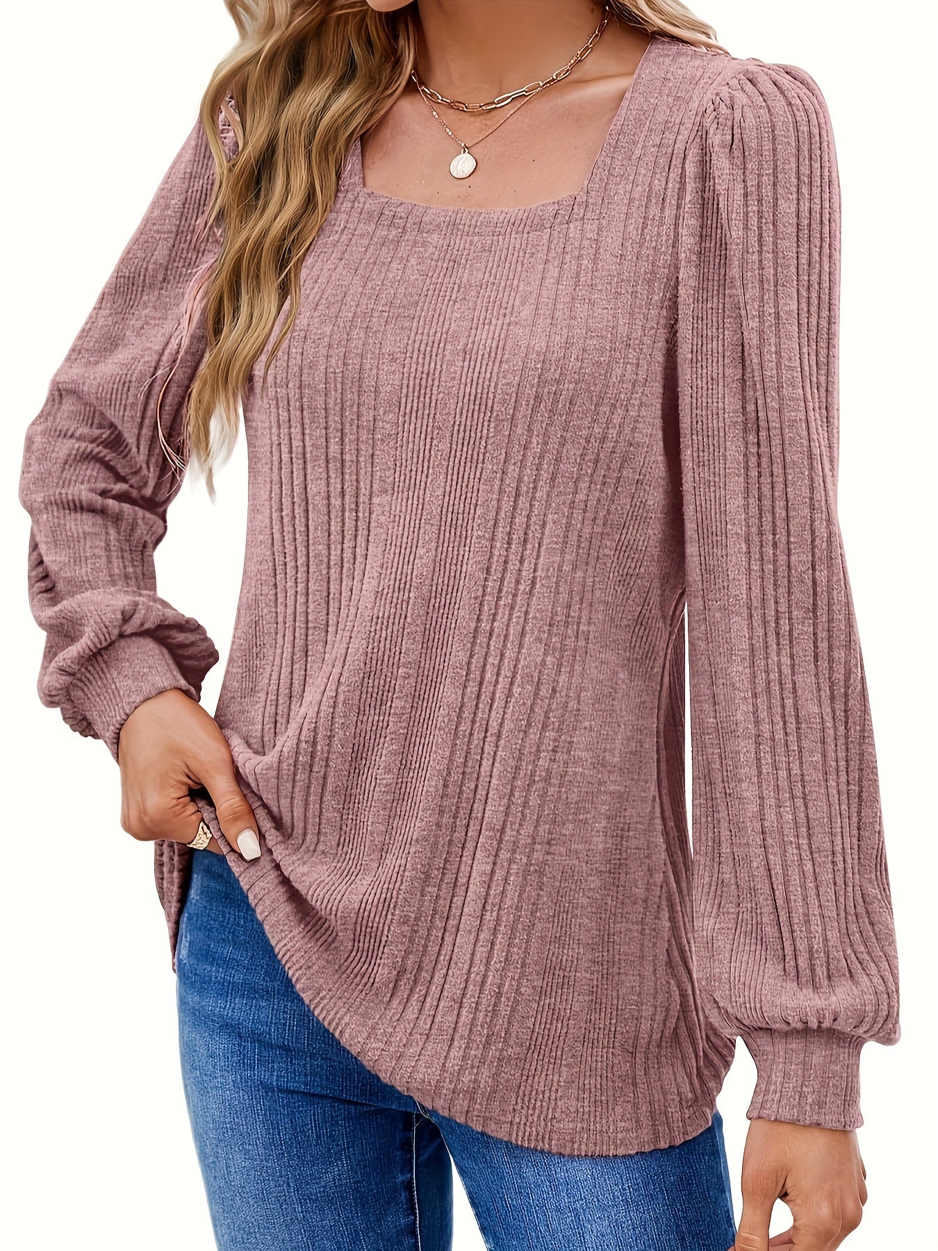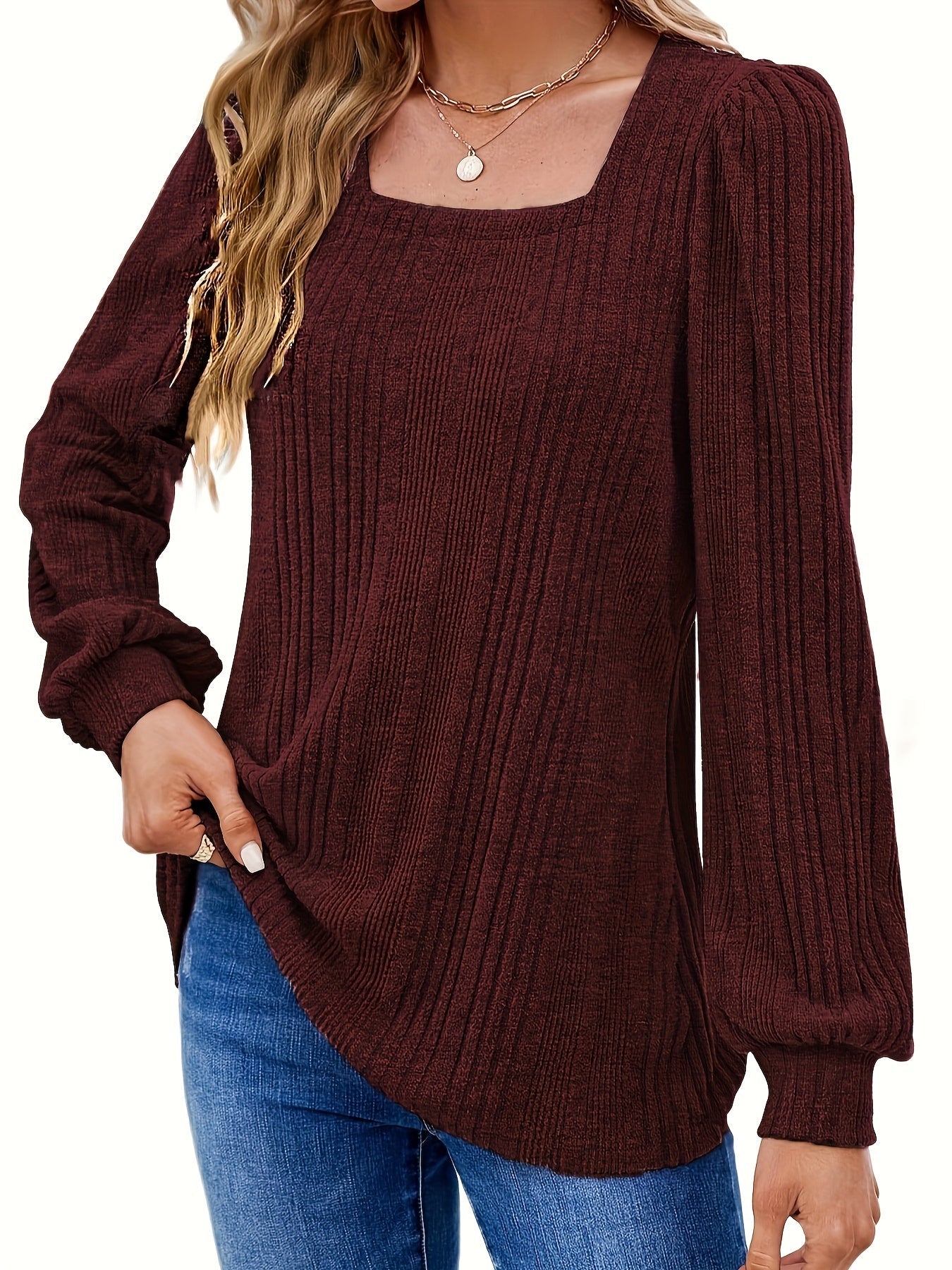 Sale Solid Square Neck Rib Knit Top, Elegant Long Sleeve Sweater