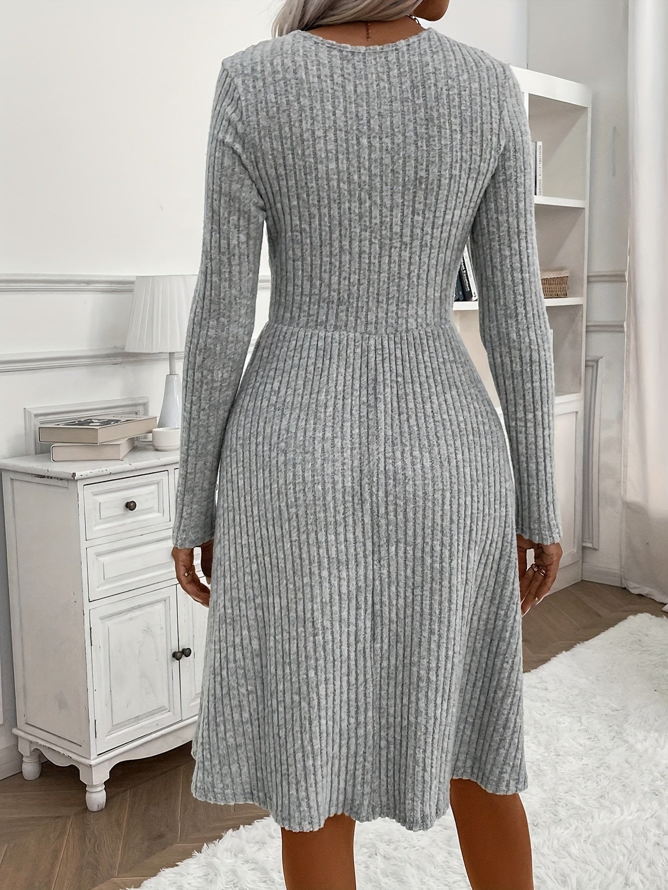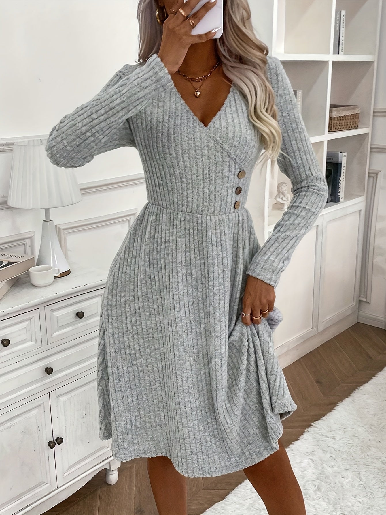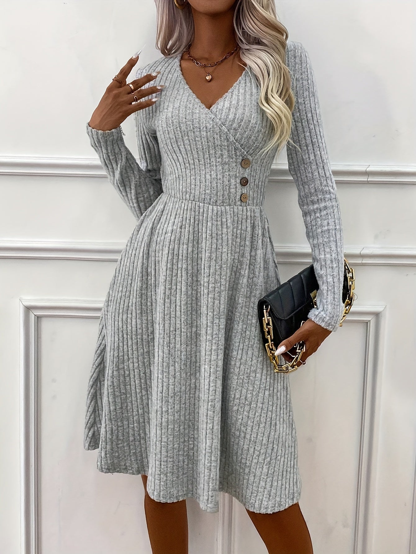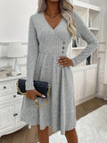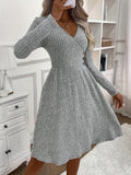 Sale Solid V-neck Button Decor Dress, Elegant Long Sleeve Slim Dress