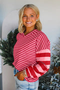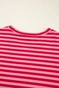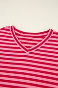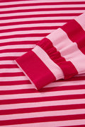 Strawberry Pink Mix Striped Drop Shoulder Patchwork Sleeve V Neck Pullover