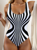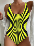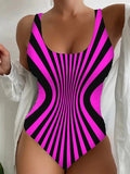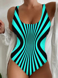 Sale Striped Color Block Backless One-piece Swimsuit, Retro Scoop Neck High Stretch Bathing Suits