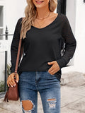 Sale Lace Splicing Swiss Dot V-neck Blouse, Elegant Long Sleeve Blouse Top
