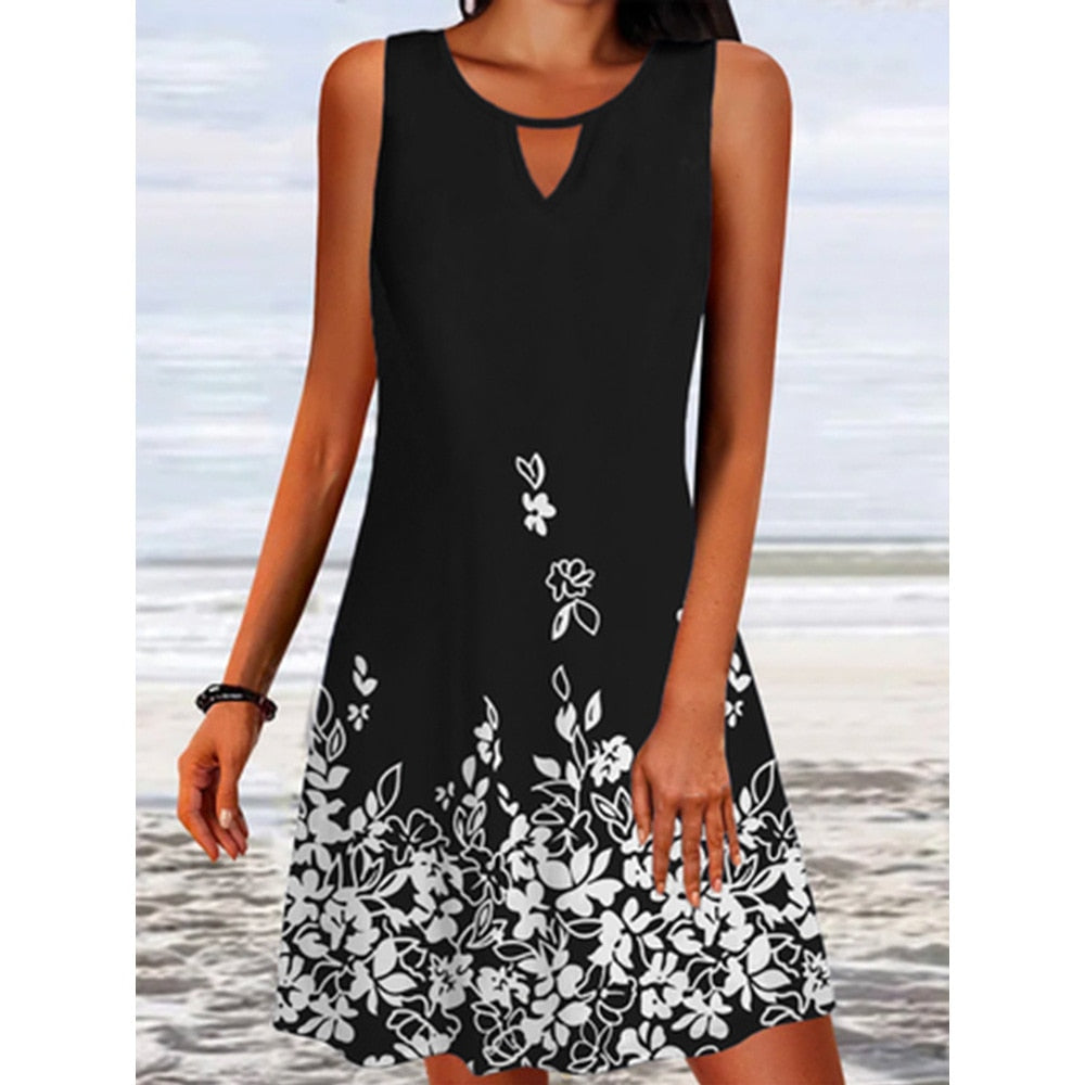 Sale A-Line Loose Printed Design Floral Casual Round Neck Sleeveless Midi Dresses