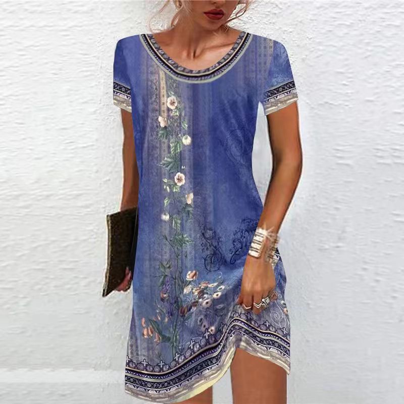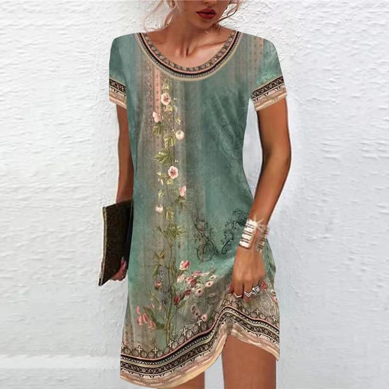 Printed Short Sleeve Round Neck Elegant Vintage Pullover Boho Flower Midi Dress