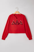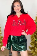 Tomato Red Christmas Tree Embroidered Notched Neck Cropped Sweatshirt