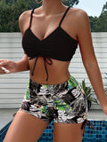 Tropical Leaf Print V Neck High Waist Bikini Sets, Drawstring Spaghetti Straps Boxer Short Bottoms Two Pieces Swimsuit