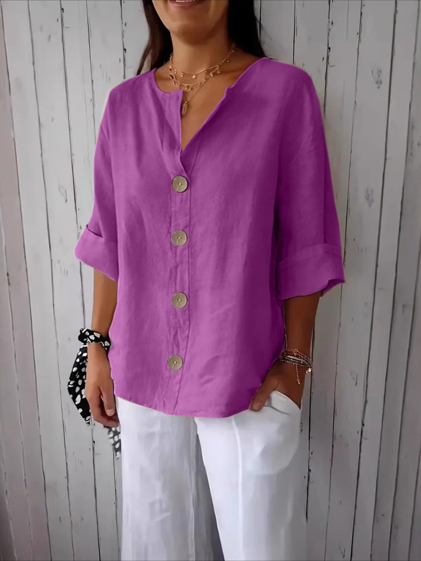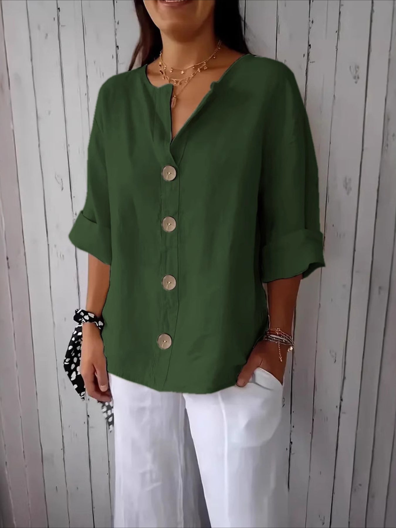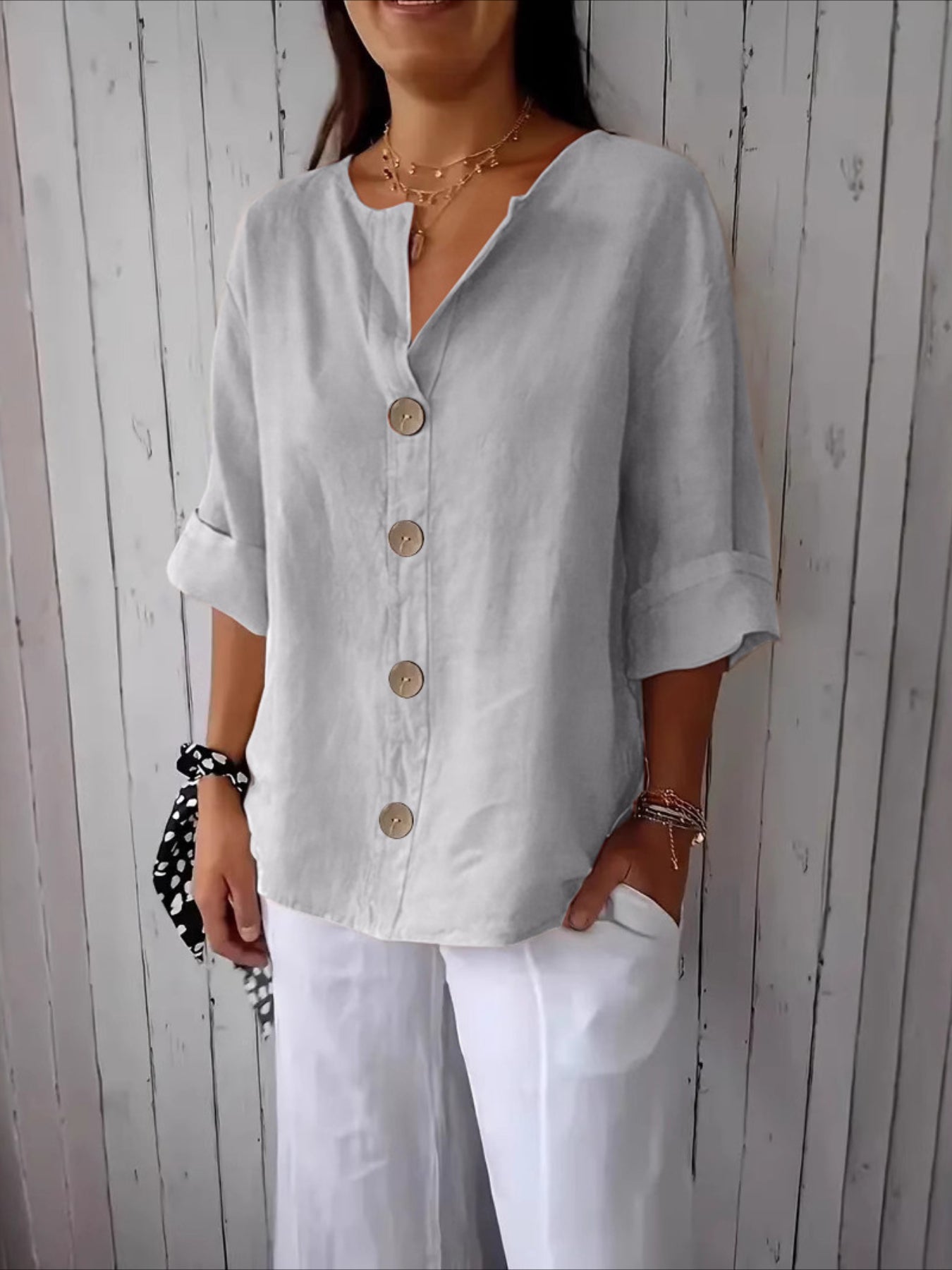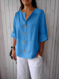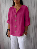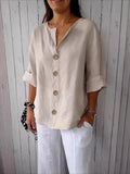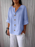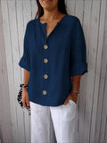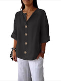V-Neck Button-Up Solid Color Short Sleeve Loose Fit Short Sleeve Shirt