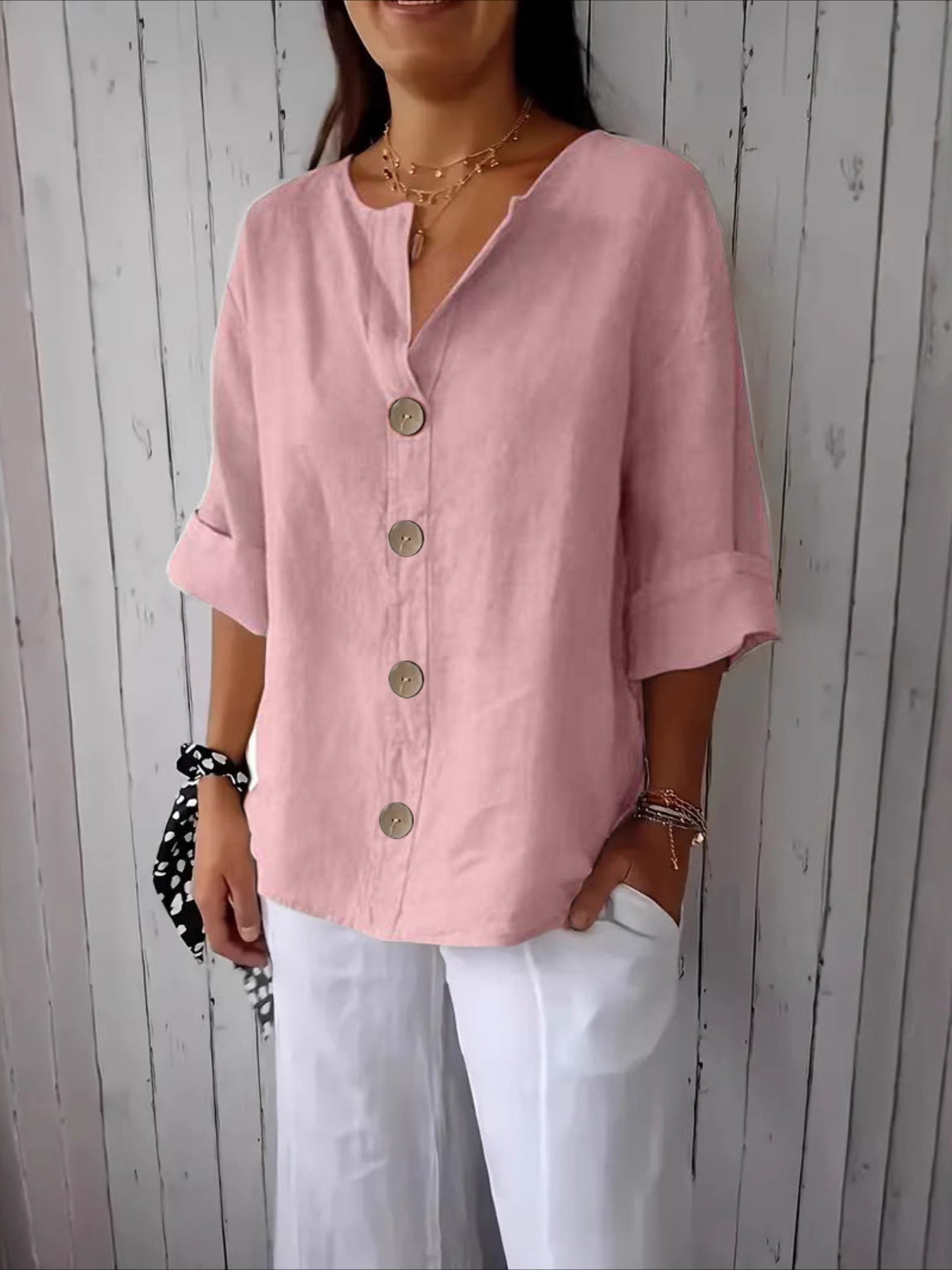 Sale V-Neck Button-Up Solid Color Short Sleeve Loose Fit Short Sleeve Shirt