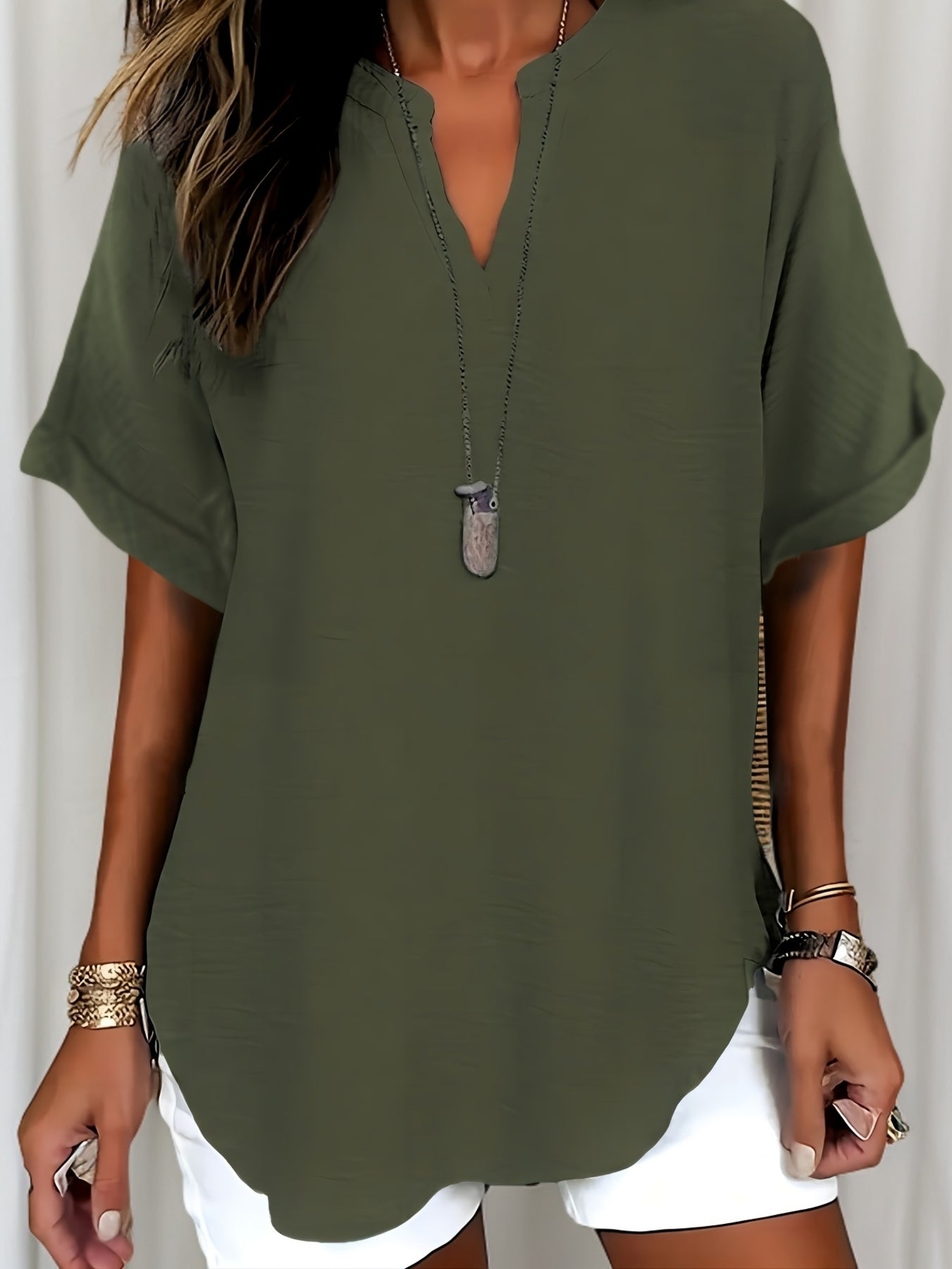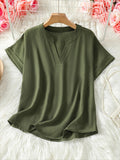 V-Neck Drop Shoulder Solid Color Loose Short Sleeve Shirt