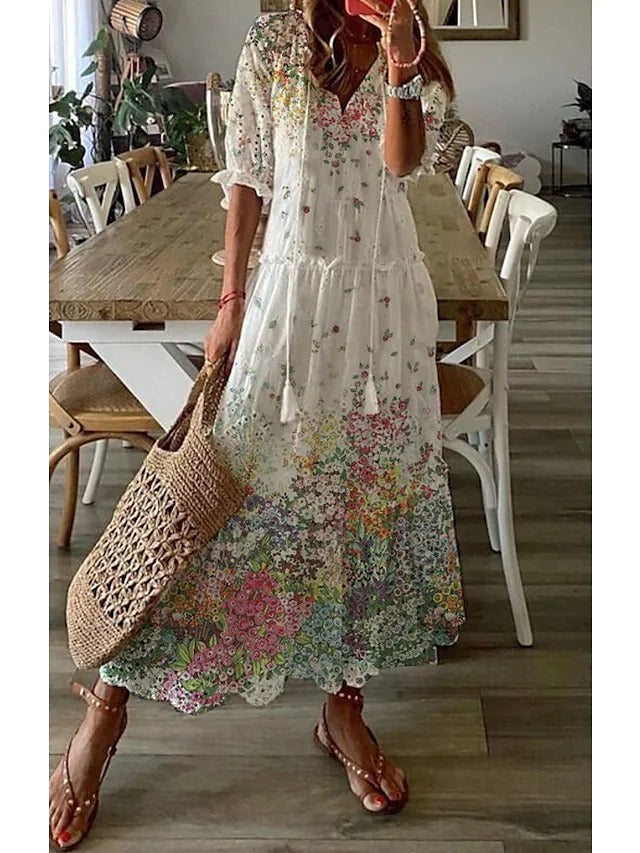 V Neck Half Sleeve Loose Floral Maxi Dress