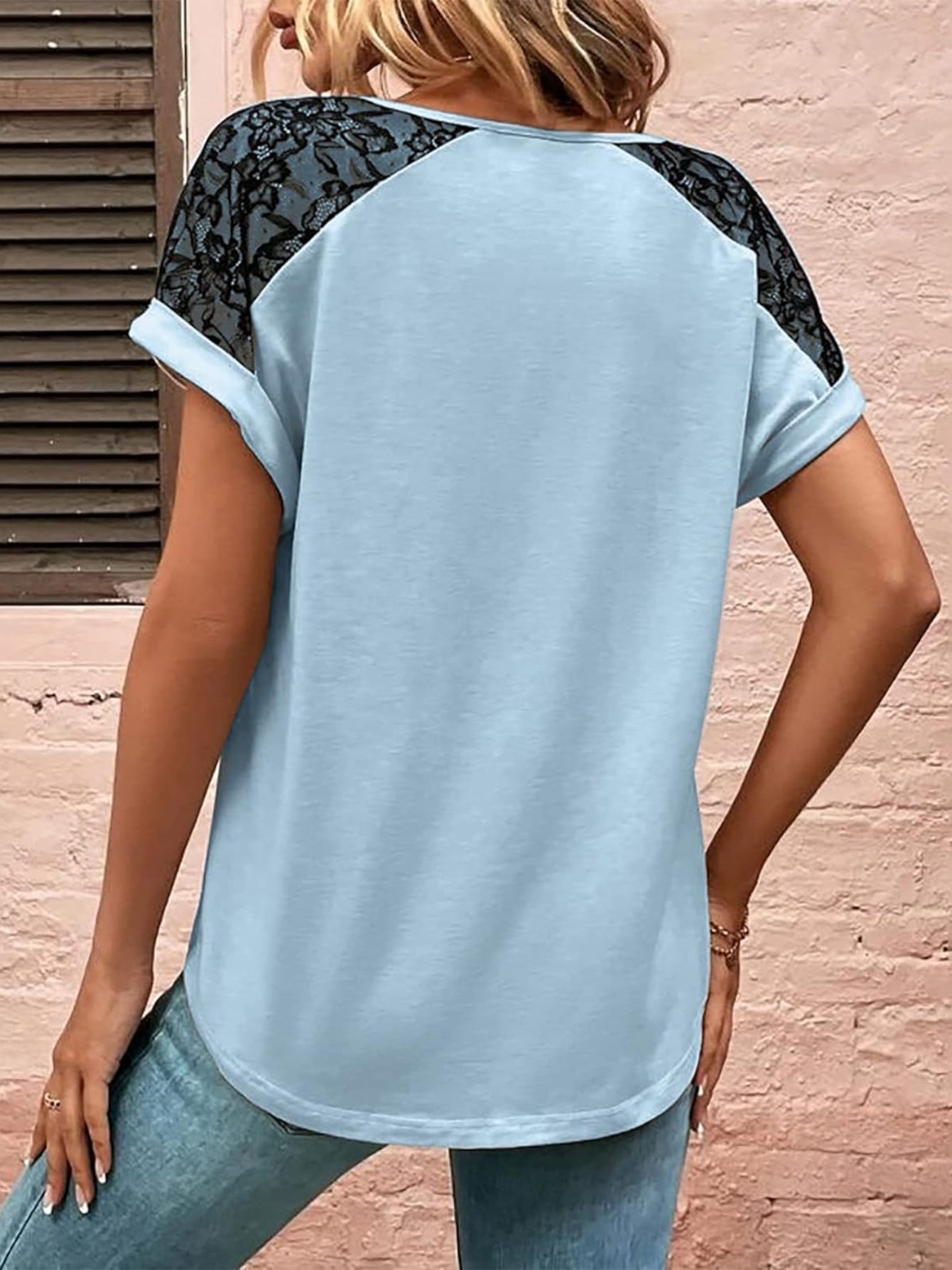 V Neck Lace Sleeve Button Design Loose Fit Soft Simple T-Shirt