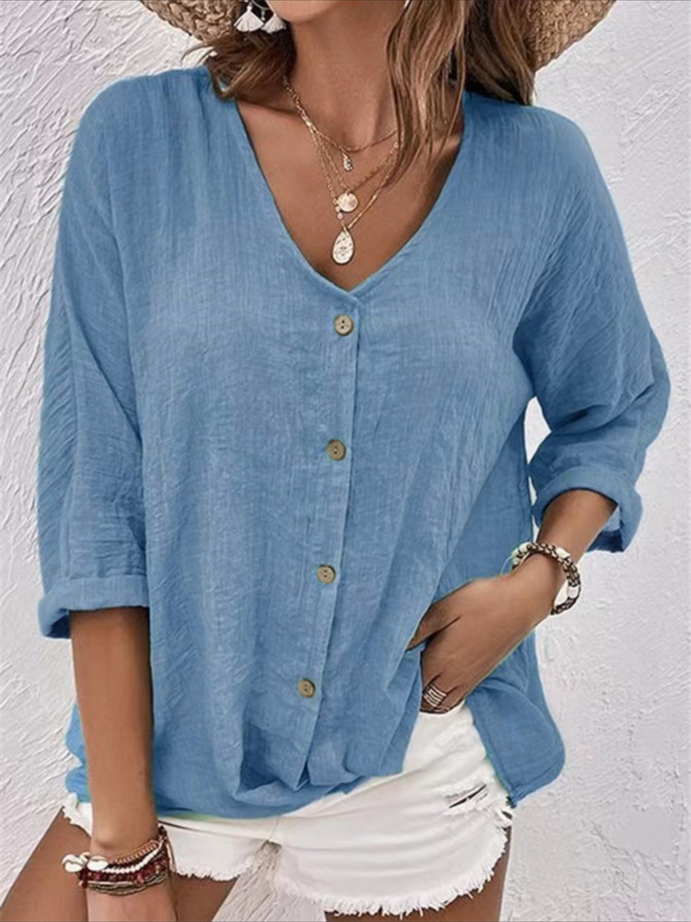 V Neck Long Sleeve Plain Regular Micro-Elasticity Shirt