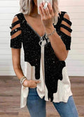 V-neck Zipper Loose Fit Printed Short Sleeve T-shirt