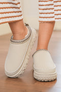 White Contrast Stitch Detail Faux Suede PU Patchwork Plush Winter Clog Slippers