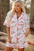 - The perfect sleep set for both comfort and style.Features a button-up top with short sleeves and matching shorts with pockets.The cowgirl country print is funny to keep wearers looking good while you relax.The fabric is ultra-soft, stretchy and lightweight for a relaxed feel.