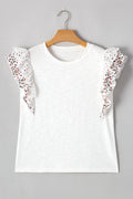 - Get the fashion elegant blouse for the new season.This is a 100% cotton top, which is soft and lightweight.Features flutter sleeves of eyelet lace and floral ruffles.It’s easy to style fashionable with any jeans or skirts.