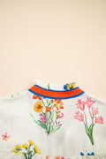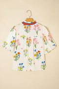 White Floral Short Puff Sleeve Contrast V Neck Print Blouse