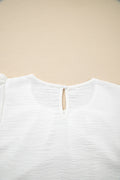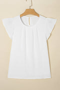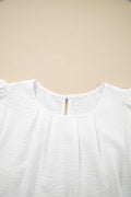 - This white blouse is graceful with flounce sleeves.The pleated detailing adds a chic detail to this women summer top.The crinkled fabric adds a textured touch and visual interest.Round neck and solid color offer a classic and versatile look.
