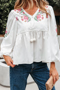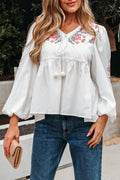 - The flower design gives an amazing wow factor.This flower blouse features a cute babydoll style.The balloon sleeves design is feminine greatly elevates the babydoll blouse.V neck with tassel detail, frilled high waist with a flowy fit.