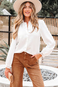 Four Leaf Clover Striped Trim Ruffle Split Neck Long Sleeve Blouse