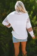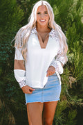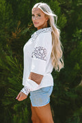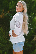 Sale White Leopard Patchwork Turn-down Collar Waffle Top