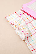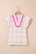 White Plaid Flutter Sleeve Colorblock Ric Rac Split V Neck Blouse