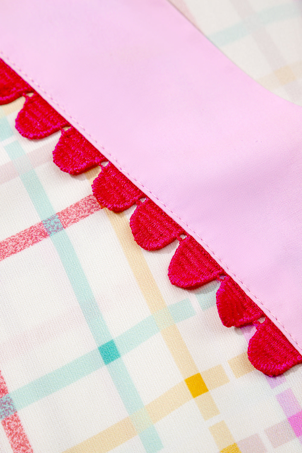 - Stylish plaid design for a trendy look.Eye-catching ric rac detailing adds charm.Flattering split V-neckline for a feminine touch.Flutter sleeves create a playful and elegant vibe.