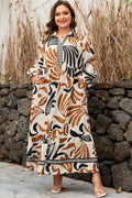 White Plus Size Abstract Print Contrast Collar Split Neck Shift Long Dress