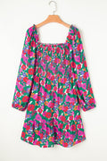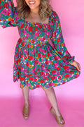 White Plus Size Floral Frilled Square Neck Shirred Long Sleeve Dress
