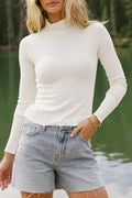 White Ribbed Knit Lettuce Trim High Neck Long Sleeve Top