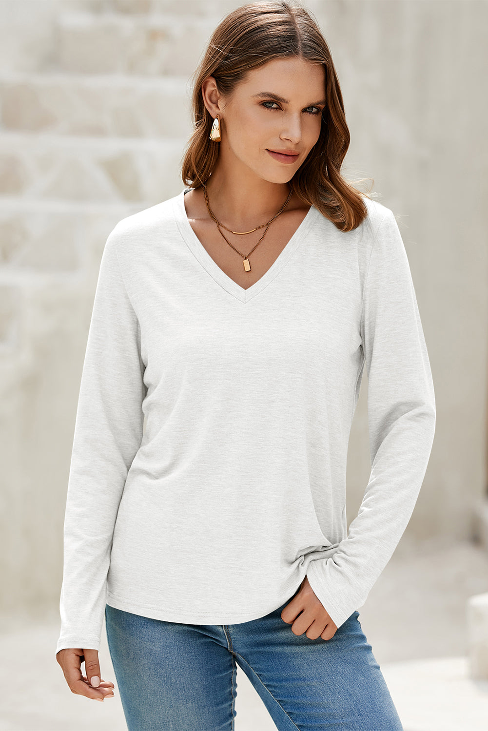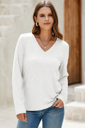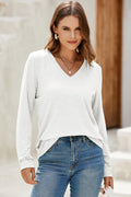 White Solid Color V Neck Long Sleeve Stretchy Top