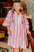 Sale White Stripe Plus Size Embroidered Detail Flared 3/4 Sleeve V Neck Dress