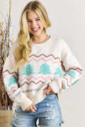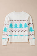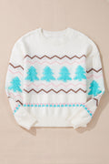 White Striped Christmas Tree Ribbed Trim Drop Shoulder Sweater