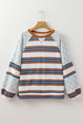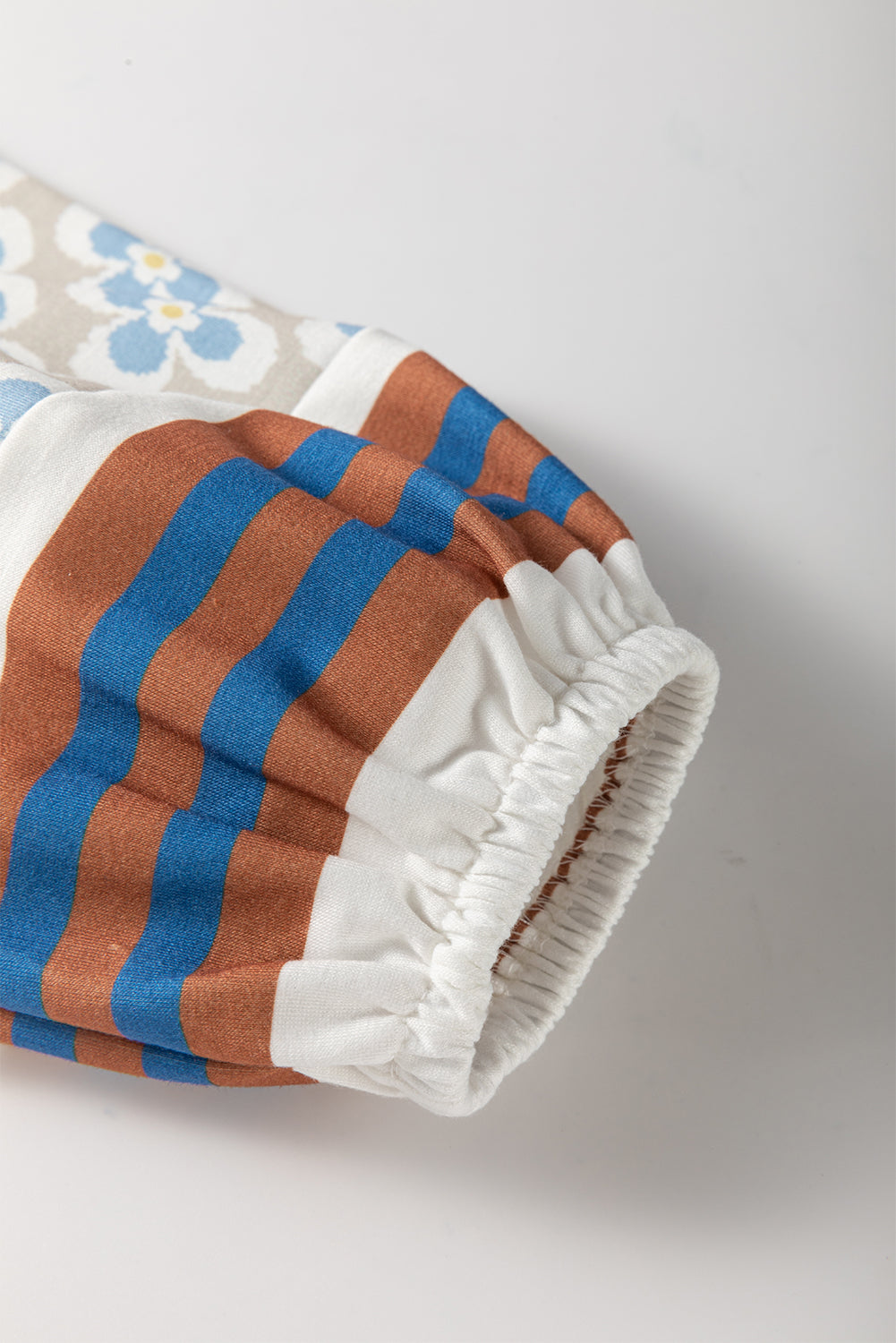 White Striped Floral Printed Patchwork Lantern Sleeve Blouse