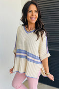 White Striped V Neck Dolman Sleeve Rib Knit Oversized Sweater with Slits