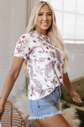 Sale Beige Floral Puff Sleeve Patchwork Round Neck Top
