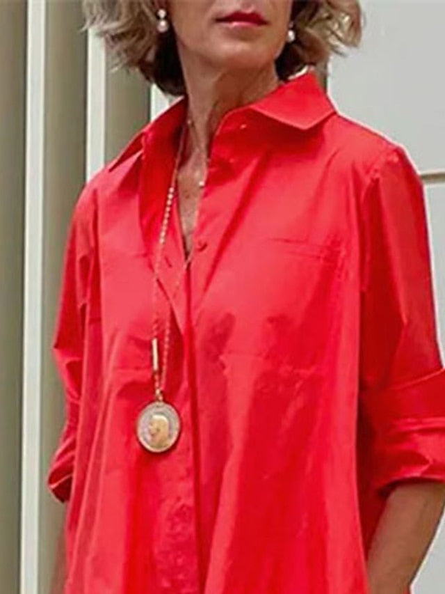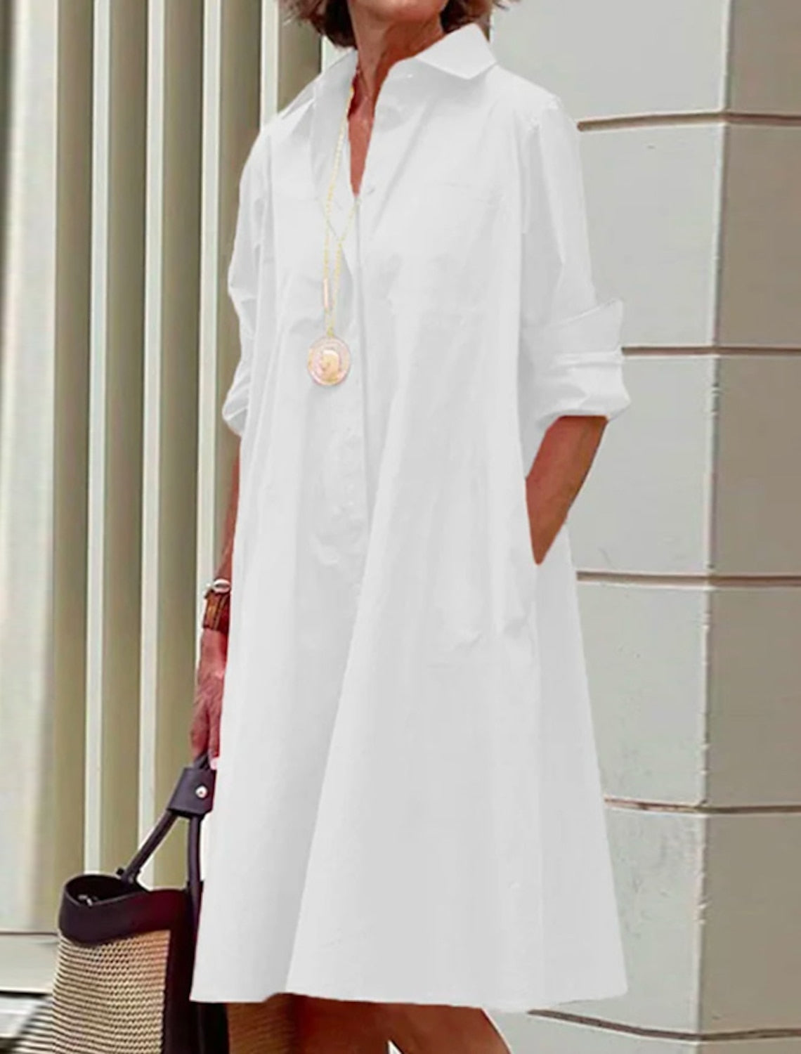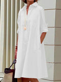 Women's Elegant Casual Shirt Collar Pocket Rolled Cuff Long Sleeve Midi Dress