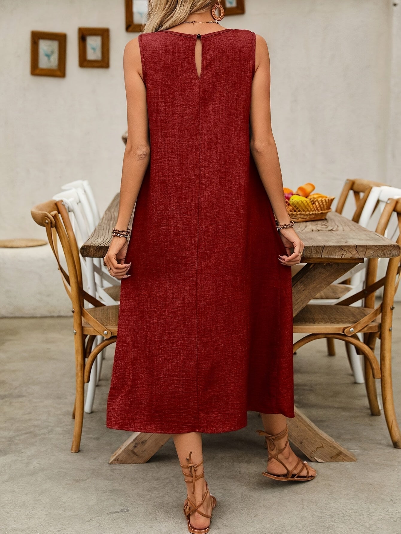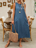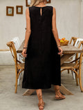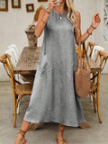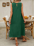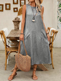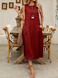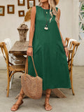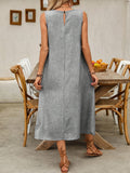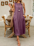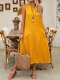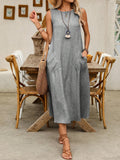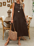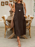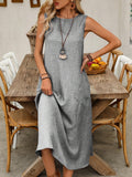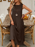 Sale Elegant Round Neck Solid Color Beige Sleeveless Midi Dress