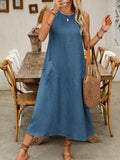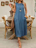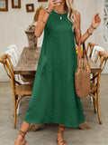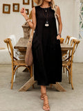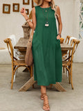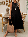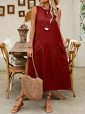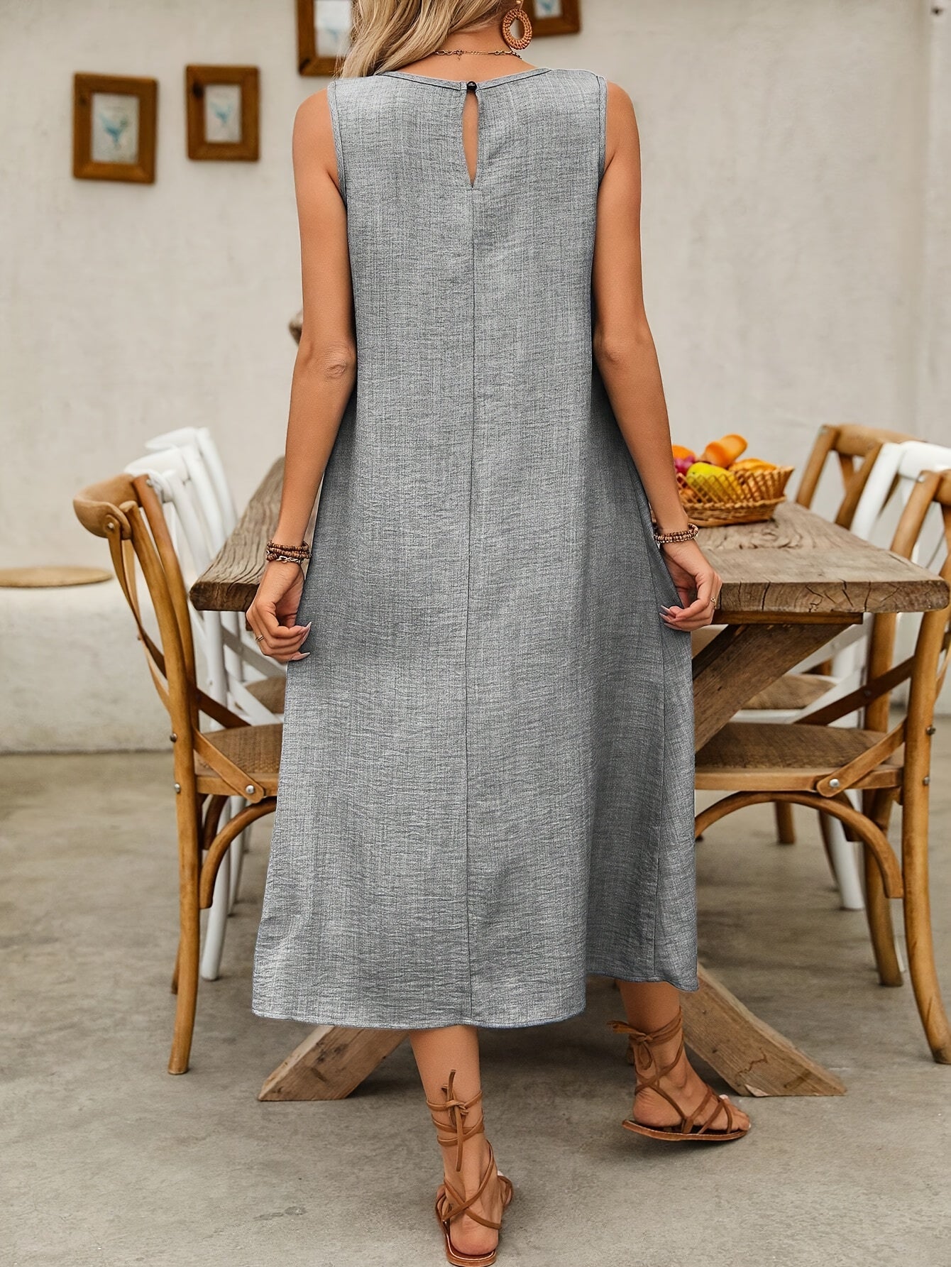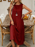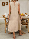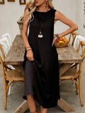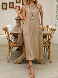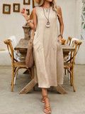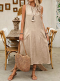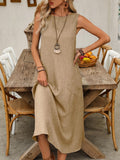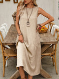 Elegant Round Neck Solid Color Beige Sleeveless Midi Dress