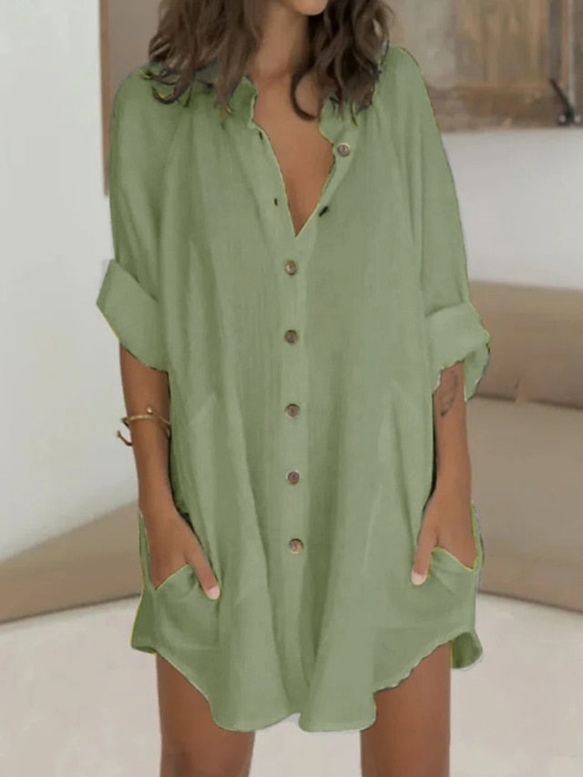 Sale Women's Long Sleeve Pure Color Button Shirt Collar Mini Dress