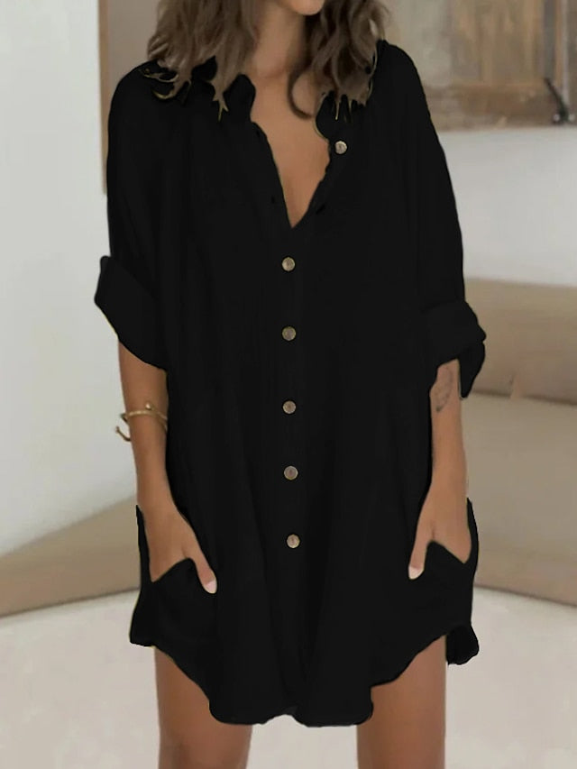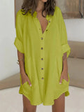 Women's Long Sleeve Pure Color Button Shirt Collar Mini Dress