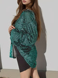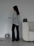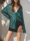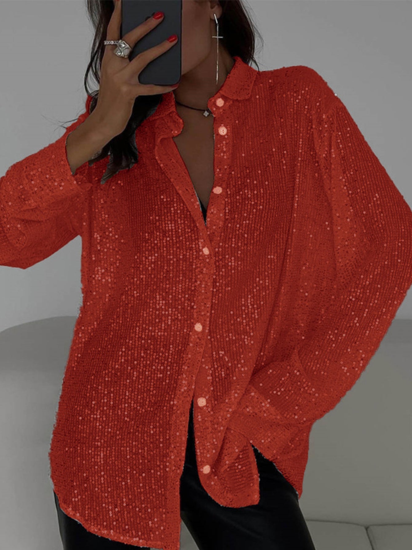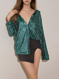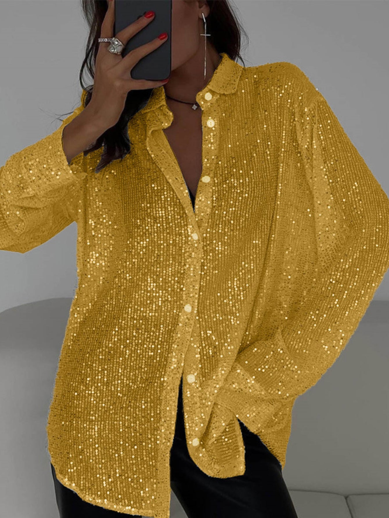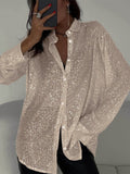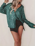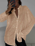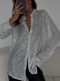 Womens Sequins Long Sleeve Collared Shirt Button Down Open Front Shirt Loose Tops