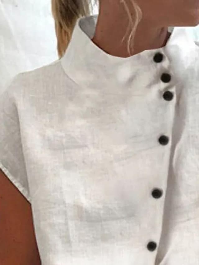 Women's Turtleneck Plain Button Short Sleeve Standing Collar Shirt Blouse