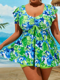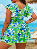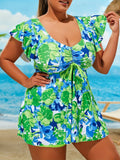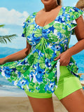 Women's Vacay Tankini Set, Plus Size Floral Pattern Drawstring Front Top & Boxer Short Bottom Swimsuit 2 Piece Set