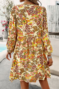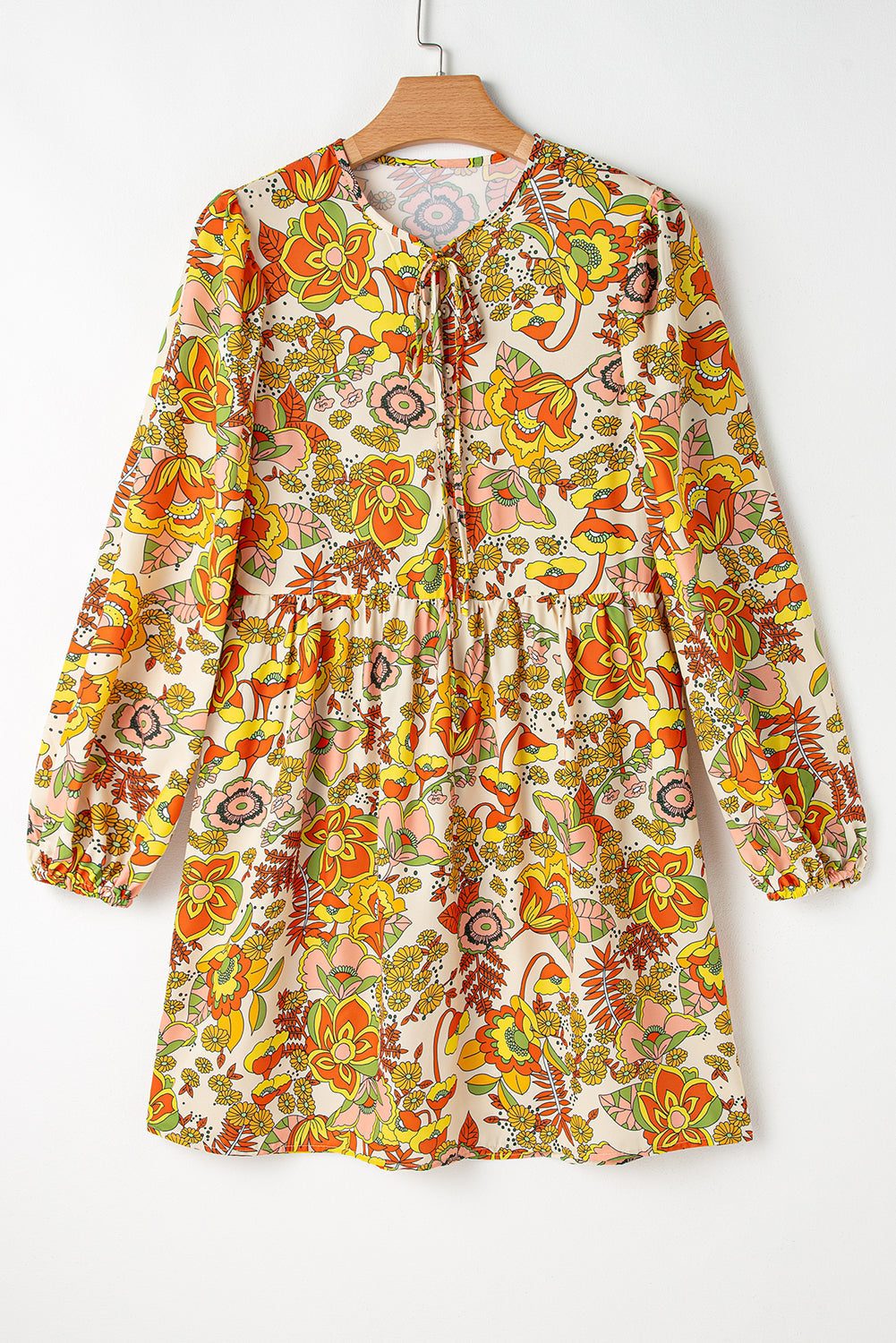 Yellow Cream Floral Print V Neck Puff Sleeve Mini Dress