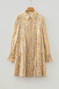 Yellow Floral Print Frilly Trim Smocked Cuff Long Sleeve Loose Shirt Dress